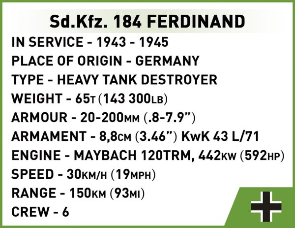 Postavte si model Panzerjäger Tiger (P) Ferdinand, německý těžký stíhač tanků používaný během 2. světové války. Byl zkonstruován na podvozku tanku Tiger I. Sériová výroba začala v roce 1943. Ferdinandové se mimo jiné účastnili bojů na východní frontě a bitvy u Kursku. Stíhače tanků Ferdinand byly vyzbrojeny výkonným protitankovým dělem PaK 43/2 L/71 ráže 88 mm, díky kterému byly účinné proti téměř všem nepřátelským vozidlům. Silný pancíř poskytoval vozidlu dobrou ochranu. Balení obsahuje 1 268 kostek stavebnice a 1 figurku vojáka.