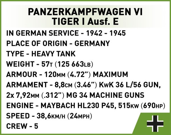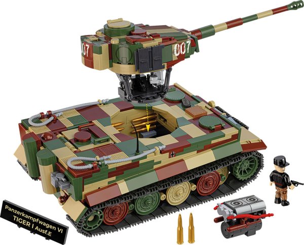 Postavte si model Panzerkampfwagen VI neboli Tiger německý těžký tank z druhé světové války. Jeho charakteristický tvar je dodnes rozpoznatelný po celém světě. Samotné vozidlo se stalo legendou a je stále přítomné nejen v historických materiálech, ale i v popkultuře. První jednotky Tiger byly dodány na frontu poblíž Leningradu a Tuniska v srpnu/září 1942. Tank navržený a vyrobený firmou Henschel byl velmi moderní a účinný. Bohužel jeho výroba spotřebovala obrovské zdroje cenných surovin a času. Tiger I a několik tanků Tiger II měly významný vliv na průběh nepřátelských akcí. Nechvalně známé a děsivé tygři zničili přes 10 300 spojeneckých tanků a 11 380 děl s vlastními ztrátami 1 725. Balení obsahuje 1207 kostek a 1 figurku.