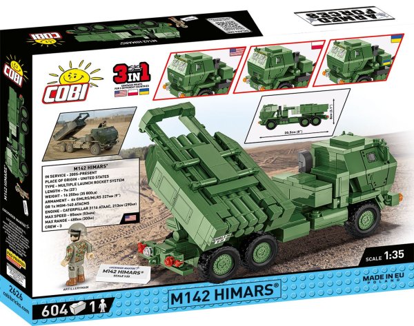 Postavte si model High Mobility Artillery Rocket System (HIMARS). Jedná se o vysoce pohyblivý raketový systém používaný ozbrojenými silami Spojených států, Polskem a Ukrajinou. HIMARS je přepravován na lehkém vojenském nákladním automobilu, který umožňuje rychlou přepravu a přístup do těžko dostupných oblastí v bojových podmínkách. Systém může odpalovat různé typy raketových dělostřeleckých granátů, včetně vysoce výbušných, protitankových a přesných raket s vysokou účinností a dosahem. Systém HIMARS si získal obzvláštní slávu díky extrémně vysoké účinnosti, s jakou jej Ukrajinci používají během probíhající války. Náš licencovaný model v měřítku 1:35 rozšiřuje kolekci současných vojenských vozidel a letadel vydávaných v kolekci ozbrojených sil (Armed Forces). Sada obsahuje figurku dělostřelce a potištěné kostky umožňují stavbu vozidla s označením jednoho ze států: Polsko, USA nebo Ukrajina. Balení obsahuje 604 kostek stavebnice a 1 figurku vojáka.