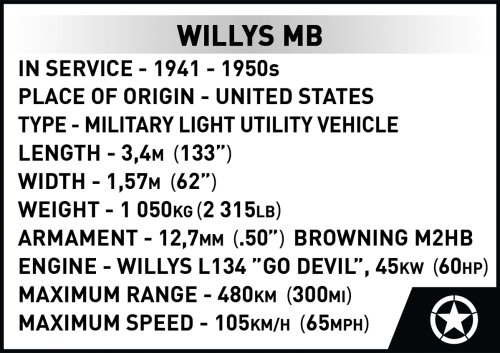 Postavte si model Jeep Willys MB legendární terénní vůz, který hrál klíčovou roli během druhé světové války. Vyráběla ho americká společnost Willys-Overland Motors a byla součástí vojenského programu určeného k poskytování vozidel pro armádu Spojených států a jejich spojence. Willys MB se vyznačoval jednoduchou konstrukcí, solidností a spolehlivostí v náročných polních podmínkách. Jeho kompaktní rozměry, odolnost a schopnost navigace v obtížném terénu z něj udělaly legendu v automobilové historii. Po válce obliba Jeepu Willys MB přispěla k rozvoji značky Jeep a stala se inspirací pro pozdější modely terénních vozů. Jeep Willys MB dnes oceňují sběratelé a milovníci vojenských předmětů a automobilové klasiky. Balení obsahuje 1207 kostek.