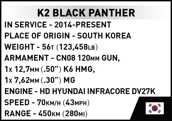 Postavte si model K2 Black Panther je hlavní bojový tank třetí generace vyvinutý v Jižní Koreji v 21. století. Jako nástupce tanku K1 je to rozhodně jeden z nejmodernějších tanků na světě. Kombinuje palebnou sílu, mobilitu a pokročilé technologie. V poslední době se tanky tohoto typu staly součástí výzbroje polské armády. Balení obsahuje 160 kostek.