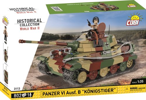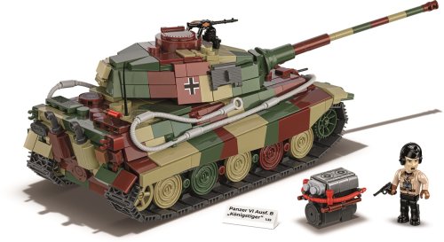 Postavte si model nejznámějšího německého tanku z 2. světové války Panzer VI Ausf. B "Konigstiger". Model je v měřítku 1:35 a sestavený měří 30 x 11,5 x 10,5 cm. Balení obsahuje 802 kostek stavebnice a figurku německého tankisty.