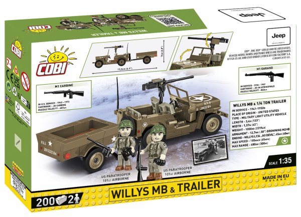 Postavte si model Jeep Willys MB legendární terénní vůz, který hrál klíčovou roli během druhé světové války. Vyráběla ho americká společnost Willys-Overland Motors a byla součástí vojenského programu určeného k poskytování vozidel pro armádu Spojených států a jejich spojence. Willys MB se vyznačoval jednoduchou konstrukcí, solidností a spolehlivostí v náročných polních podmínkách. Jeho kompaktní rozměry, odolnost a schopnost navigace v obtížném terénu z něj udělaly legendu v automobilové historii. Po válce obliba Jeepu Willys MB přispěla k rozvoji značky Jeep a stala se inspirací pro pozdější modely terénních vozů. Jeep Willys MB dnes oceňují sběratelé a milovníci vojenských předmětů a automobilové klasiky. Balení obsahuje 200 kostek a 2 figurky.