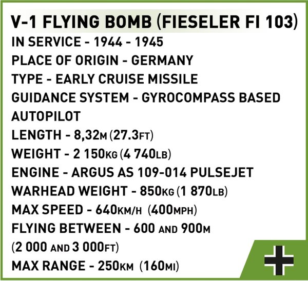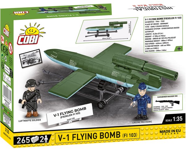 Postavte si model Létající bomba V-1 (Fisseler Fi 103) v měřítku 1:35 vám umožní vytvořit jeden z nejpřelomovějších vynálezů druhé světové války – raketu V-1, známou také jako „létající bomba“. V1 byl navržen německým inženýrem Fritzem Gosslámem a byl první zbraní, která spojila rysy letounu a rakety a stala se základem pro pozdější balistické rakety. Balení obsahuje 265 kostek a 2 figurky.