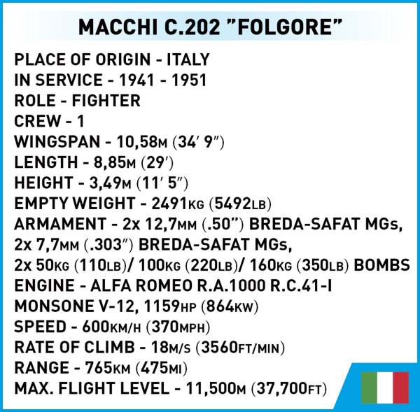 Postavte si model Macchi MC.202 byl vývojem dřívějšího modelu MC.200 Saetta, který měl horší výkon. Konstruktér Mario Castoldi použil motor Daimler-Benz DB 601Aa, který výrazně zlepšil výkon letounu ve srovnání s jeho předchůdcem. Prototyp MC.202 poprvé vzlétl 10. srpna 1940. Sériová výroba začala v roce 1941 a ve stejném roce byly dodány první letouny do lineárních jednotek. MC.202 byl široce používán v africké kampani, kde představoval vážnou hrozbu pro spojenecké stíhačky. Jeho rychlost a ovladatelnost byly na stejné úrovni jako Spitfiry a P-40 Warhawky, se kterými se setkal v boji. Po pádu severní Afriky byl MC.202 používán k obraně italského území proti spojeneckým náletům a v bojích o Sicílii. MC.202 sloužil také na Balkáně a při obraně Rhodosu. Letoun byl velmi obratný, což z něj činilo impozantního protivníka ve vzdušných bojích, a jeho odolná a pevná konstrukce trupu mu umožňovala přežít v těžkých bojových podmínkách. Letadlo nebylo bez závad. Relativně lehká výzbroj ve srovnání se spojeneckými stíhačkami v podobě 12,7mm kulometů byla méně účinná než kanóny, které byly instalovány v mnoha spojeneckých a německých stíhačkách. Balení obsahuje 404 kostek a 1 figurku.