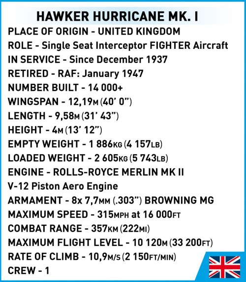 Postavte si model legendárního letounu HAWKER HURRICANE – stroj, který bojoval za svobodu pod oblohou Anglie! Byl postaven v roce 1942 v kanadské slévárně automobilů a původně se vydal na 123. kanadskou eskadru. Válku přežil a v roce 1985 byl obnoven tak brilantně, že o čtyři roky později absolvoval svůj další let. Balení obsahuje 375 kostek a 1 figurku.