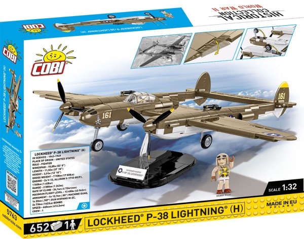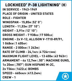 Postavte si model P-38H v nové verzi od COBI je více než jen model – je to pozvánka k cestování v čase, který nás zavede ve třicátých letech. Dvacáté století, kdy Clarence "Kelly" Johnson navrhl tuto jedinečnou stíhačku. P-38H byl jedním z klíčových amerických letadel během druhé světové války, známý svým neobvyklým designem, včetně dvojitého trupu. Poháněn dvěma motory Allison V-1710-111 s 1,425 koní, dosáhl impozantního výkonu 2,850 koní. Balení obsahuje 652 kostek a 1 figurka.
