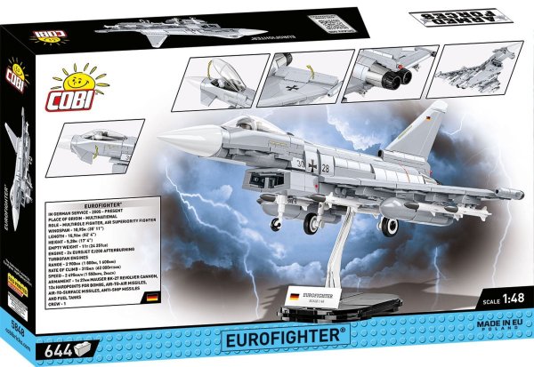 Postavte si model letounu Eurofighter. Jedná se o víceúčelovou proudovou stíhačku vyvinutou konsorciem Eurofighter GmbH sdružujícím Velkou Británii, Německo, Itálii a Španělsko. Letoun byl uveden do provozu v roce 2003 a používá jej několik zemí po celém světě. Eurofighter Typhoon je schopen nadzvukové rychlosti a je vysoce ovladatelný. Toto jednomístné letadlo je vybaveno pokročilými radarovými a elektronickými systémy a má schopnost detekovat, sledovat a zasahovat vzdušné a pozemní cíle pomocí nesených raketových zbraní a bomb. Maximální rychlost Eurofighteru je přibližně 2 495 km/h a operační dosah je přibližně 2 900 km. Balení obsahuje 644 kostek stavebnice a model je v měřítku 1:48.