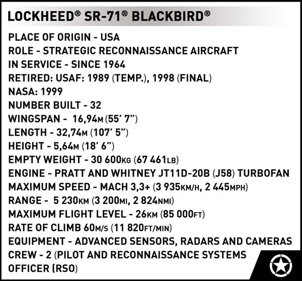Postavte si model SR-71 Blackbird americký průzkumný letoun, který sloužil v letectvu Spojených států od 60. do 90. let 20. století. Byl navržen společností Lockheed Martin a byl jedním z nejrychlejších letadel na světě. Jeho maximální rychlost přesahovala Mach 3 (přes 3 700 km/h) a díky operační výšce až 26 km byl obtížně sestřelitelný systémy protiraketové obrany. SR-71 měl pokročilou konstrukci využívající titan, který mu umožňoval odolat extrémním teplotám vznikajícím při nadzvukovém letu. Používal se především pro shromažďování zpravodajských informací a jeho schopnost uniknout nepřátelským střelám byla legendární výhodou. Balení obsahuje 1374 kostek a 1 figurku.