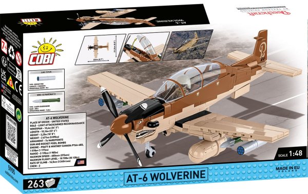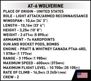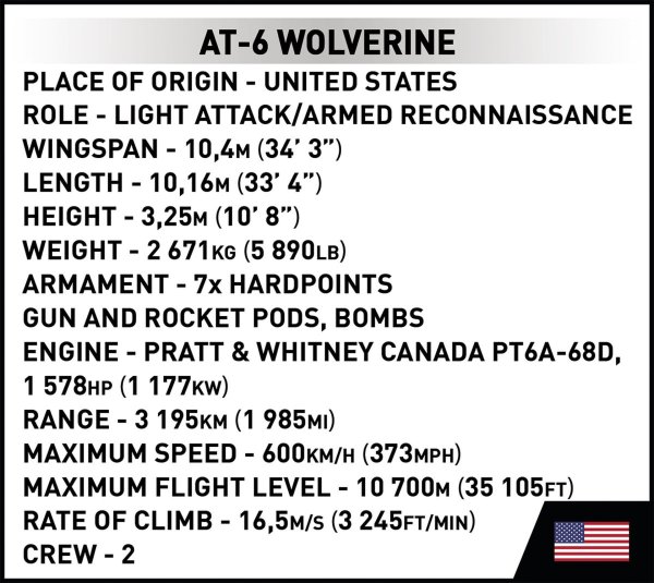 Postavte si model AT-6 Wolverine je moderní verze legendárního T-6 Texanu – letadla, které se během druhé světové války stalo jedním z pilířů leteckého výcviku. Texasan, také známý jako "Harvard", byl použit letectvem 30 zemí po celém světě, včetně USA, Kanady, Spojeného království a Austrálie. Od počátku čtyřicátých let. 20. století se stalo základním nástrojem, jak se naučit létat pro více než 200.000 pilotů, stejně jako jedním z nejznámějších cvičných letadel v historii. Balení obsahuje 263 kostek.