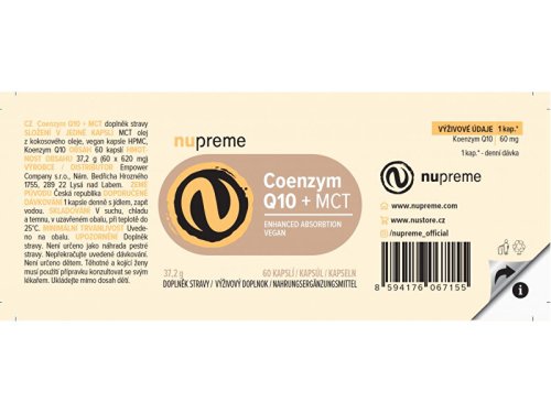 Doplněk stravy Nupreme Coenzym Q10 + MCT obsahuje rozpuštěný fermentovaný koenzym Q10 v MCT oleji ve vegan kapsli HPMC. MCT olej je výtažek z kokosového oleje, který dokáže usnadnit vstřebávání nejen koenzymu Q10, ale i dalších cenných látek. Koenzym Q10 je životně důležitá látka, která se přirozeně nachází v lidském organismu. Je přítomný v každé buňce lidského těla. S přibývajícím věkem jeho produkce klesá, a proto je vhodné koenzym Q10 doplňovat v potravě, zejména ve stáří.