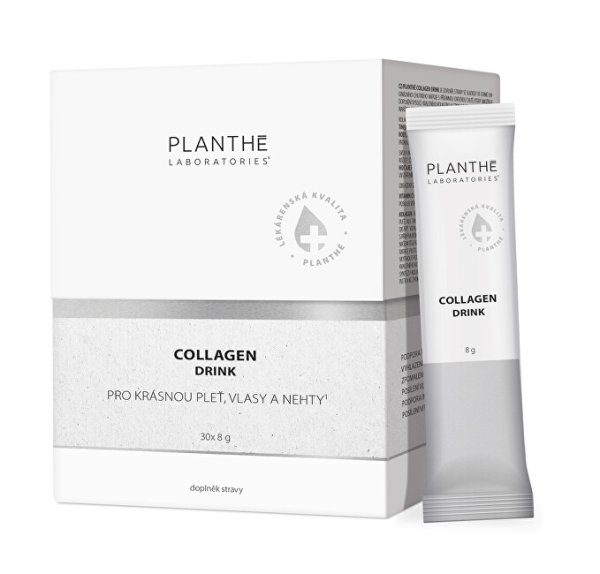 PLANTHÉ Collagen drink je doplněk stravy se sladidly ve formě originálního chutného nápoje s příjemnou ovocnou chutí, který umožňuje doplnění vysoce kvalitního kolagenu a stimulaci jeho tvorby, která se s narůstajícím věkem zpomaluje.Kolagen je doplněn COLLAGEN+ komplexem 8 účinných látek – zinkem, biotinem, vitaminem C, vitaminem B5, extrakty višně, Aloe vera s fytosteroly, zeleného čaje a regeneračním faktorem VITAE® z chlorelly, které prokazatelně regenerují, projasňují a omlazují pleť.Kolagen je vnímán jako stavební kámen nejen pro zdravou a pružnou pleť, ale také pro klouby a šlachy. Tento protein je zodpovědný za mladistvý vzhled pleti, za udržení struktury, pevnosti a elasticity kůže. S přibývajícím věkem však hladina kolagenu a schopnost jeho biosyntézy v našem těle klesá, což vede k výskytu vrásek, ztrátě elasticity, svěžesti i hydratace pleti.Právě doplňování kolagenu zevnitř může tělu a pokožce poskytnout potřebné stavební prvky pro tvorbu kolagenu. Pravidelné užívání kvalitního kolagenu s dalšími aktivními složkami, které navíc stimulují biosyntézu kolagenu, pak může vést k hladší, zdravější a celkově mladistvější pleti a ke zpomalení procesu stárnutí pokožky i lepší kvalitě vlasů a nehtů.