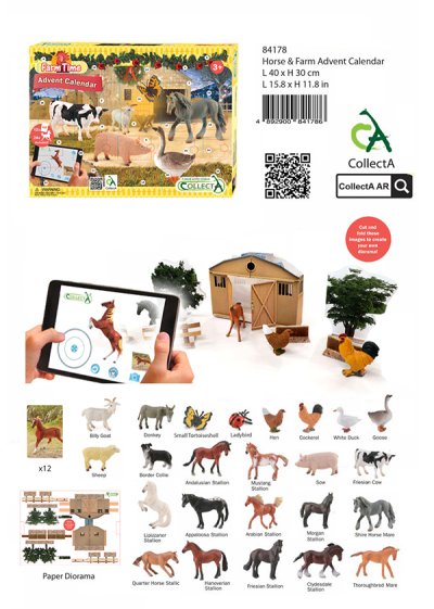 Adventní kalendář zpříjemní čekání na Ježíška. Každý den od 1. až do 24. prosince ti čekání zpříjemní jedna figurka zvířátka z farmy. Adventní kalendář obsahuje 12 kartiček, pomocí kterých můžeš rozpohybovat zvířátka z farmy. Jak na to? Stáhni si do svého mobilního telefonu nebo tabletu aplikaci CollectA AR. Otevři aplikaci a namiř telefon nebo tablet na kartičku zvířátka. Zvířátko se ti začne hýbat. Pomocí šipek ovládáš jeho pohyb. Bude chodit, kam budeš chtít. Můžeš si ho i pohladit. Pomoci tlačítka „otevřené tlamy“ ovládáš zvukové efekty. Tlačítko „i“ skrývá informace o zvířátku v anglickém jazyce. Zvířátko si můžeš i vyfotit. Fotky se uloží do galerie telefonu nebo tabletu.