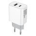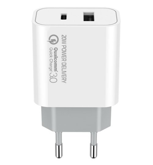 Síťový adaptér s výstupem 1x USB typ A a 1x USB typ C, podporou Quick Charge 3.0 a výstupním výkonem 20 W.