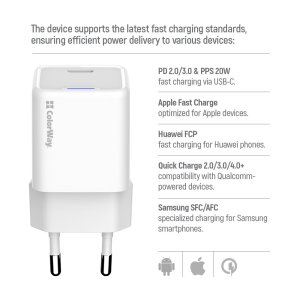 Díky inteligentnímu čipu nabíječka automaticky detekuje připojené zařízení a optimalizuje nabíjecí parametry až do 3 A pro maximální efektivitu. Podporuje všechny moderní rychlonabíjecí protokoly včetně PD 3.0, Huawei FCP, Quick Charge a Samsung AFC, což zajišťuje kompatibilitu s většinou současných smartphonů a tabletů.