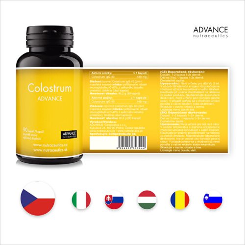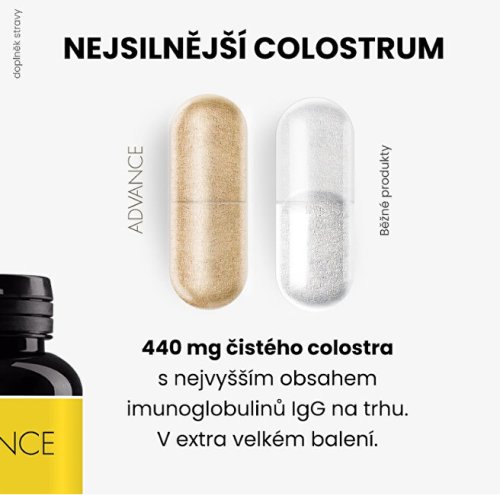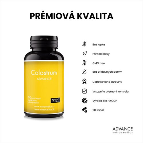 Doplněk stravy Colostrum ADVANCE obsahuje kvalitní prémiové colostrum s vysokým obsahem imunoglobulinů IgG v 1 kapsli. Přípravek Colostrum ADVANCE obsahuje kravské (bovinní) colostrum, které pochází z chovu na farmě v České republice v ekologicky čistém prostředí. To zaručuje vysokou kvalitu a čistotu získaného colostra.Celý výrobní proces přípravku Colostrum ADVANCE je maximálně šetrný a zohledňuje snahu zachovat v colostru všechny hodnotné aktivní látky. Na konci výroby následuje výstupní kontrola suroviny u výrobce. Dále je prováděna i nezávislá kontrola kvality v akreditované laboratoři - mikrobiologická a chemická analýza.