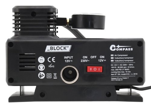 Kompresor je vhodný k huštění pneumatik osobních automobilů, motocyklů, či jízdních kol. Součástí balení jsou přídavné adaptéry pro různé použití (huštění míčů, matrací, bazénů a pod.).