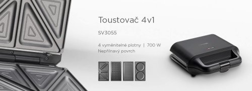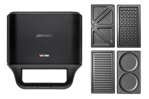 Toustovač 4v1 Concept SV3055 v elegantním černém designu vám pomůže s rychlou přípravou snídaně, obědu, svačiny i večeře. Díky čtyřem vyměnitelným deskám nabízí široké využití. Stačí si jen vybrat, na co máte zrovna chuť. V jednom těle získáte hned čtyři praktické pomocníky, kteří vám v kuchyni zaberou minimum místa.