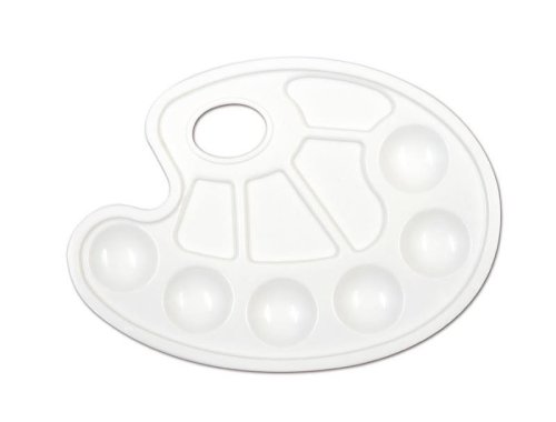 Bílá malířská paleta s 6-ti miskami pro barvy a 4 miskami pro míchání barev. Vyrobená z odolného a pružného plastu. Rozměry palety: 23 cm (širší strana) x 17 cm (užší strana). Dodávaná v bílé barvě v závěsu.
