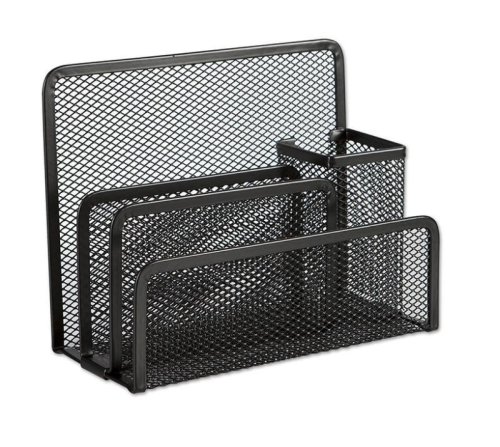 Kovový organizér na dopisy a psací potřeby v černé barvě. Rozměry: šířka 17cm, výška 13,5cm, hloubka 8,3cm.