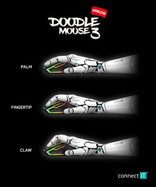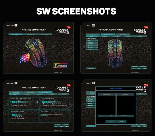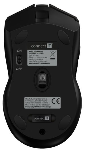 Myš využívá technologie jako povrchový RubberGrip pro eliminaci klouzavosti dlaně, UltraSlides Black pojezdy pro maximální možnou rychlost na podložce. Nechybí ani technologie AutoPowerSave šetřící kapacitu baterie. Software je zdarma ke stažení na stránkách www.connectit-europe.com. Vysokou odolnost garantují špičkové mechanické spínače Huano s životností 3 miliony kliknutí. Samozřejmostí je pozlacený USB Nano přijímač a dodávaný nabíjecí kabel.