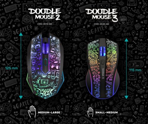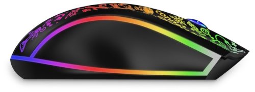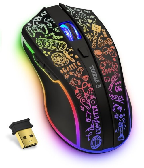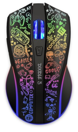 Profesionální bezdrátová gamingová myš DOODLE 3 pro hráče počítačových her s Rainbow podsvícením těla i kolečka v mixu 7 barev. Dodávaný SW s četnými nastaveními podporuje uživatelská makra, 5 uživatelských profilů a 6 programovatelných tlačítek včetně posuvného kolečka. Precizní optický senzor má nastavitelnou citlivost až na 4800 DPI.