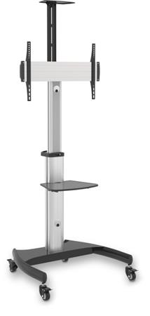 Velmi praktický pojízdný stojan je určen pro variabilní umístění TV kdekoliv v interiéru. Díky stojanu můžete přesouvat TV rychle a pohodlně kamkoliv podle potřeby. Navíc je vybaven dvěma praktickými poličkami na DVD, kameru atp. Robustní konstrukce v kombinaci oceli a slitiny hliníku unese spolehlivě až 50 kg obrazovku. Police mají každá nosnost 5 kg. Stojan je kompatibilní s obrazovkami do úhlopříčky 70" a pro nejvyšší možnou stabilitu je vybaven kolečky s brzdovou mechanikou proti nechtěnému pojezdu. Komfort zvyšuje možnost výškového polohování obrazovky.