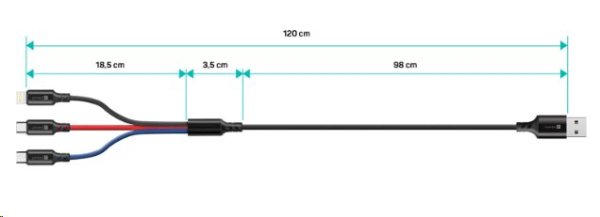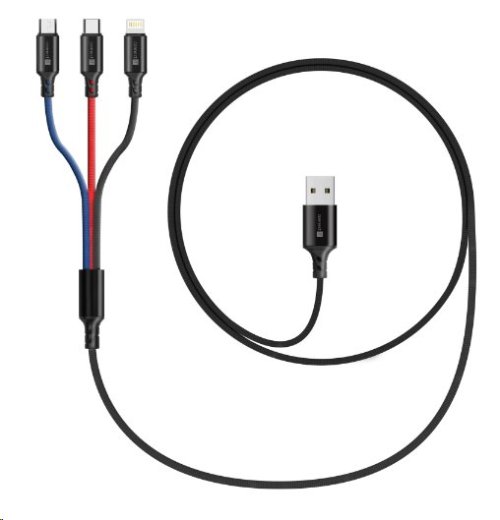Univerzální nabíjecí kabel 3v1 na nabíjení zařízení s konektory Micro USB, Lightning a USB-C (Type C) umožňuje nabíjení až tří zařízení současně s podporou rychlého nabíjení pomocí max. proudového toku 2 A. Speciální manžetová nadstavba konektorů Micro USB, Lightning i USB-C (Type C) zaručuje lepší přístupnost k nabíjecím zdířkám mobilních telefonů v pouzdrech.