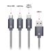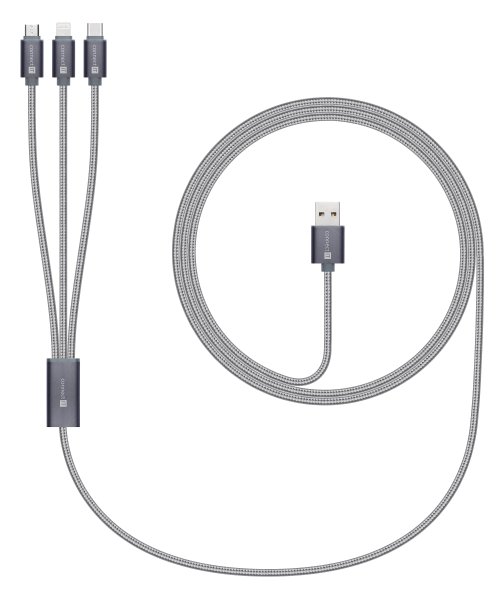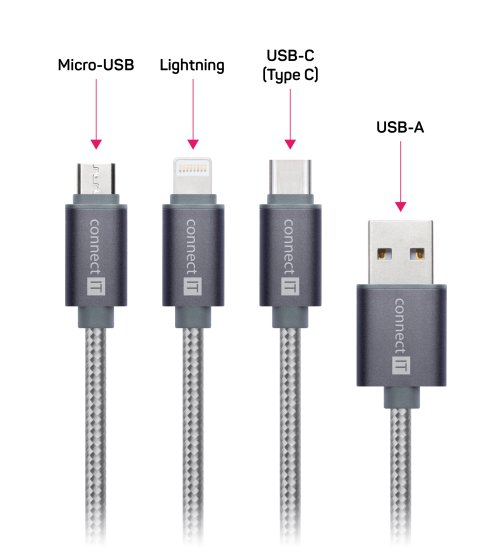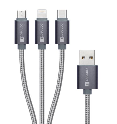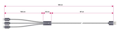 Univerzální nabíjecí kabel 3v1 na nabíjení zařízení s konektory Micro USB, Lightning a USB-C (Type C) umožňuje nabíjení až tří zařízení současně s podporou rychlého nabíjení pomocí max. proudového toku 2 A. Speciální manžetová nadstavba konektorů Micro USB, Lightning i USB-C (Type C) zaručuje lepší přístupnost k nabíjecím zdířkám mobilních telefonů v pouzdrech.