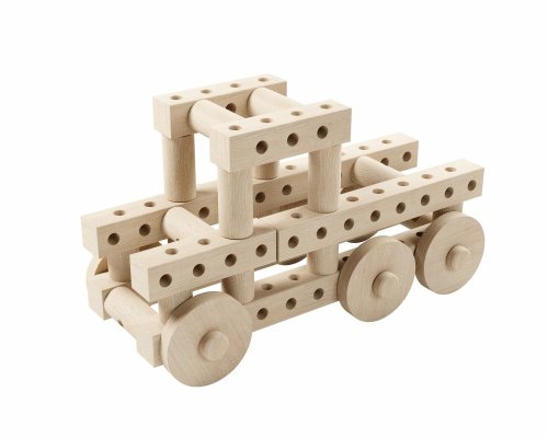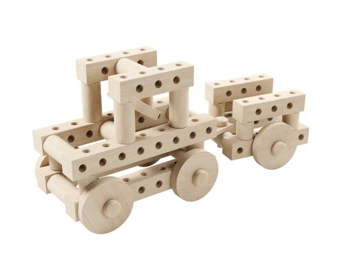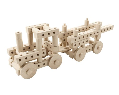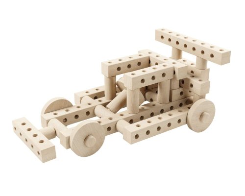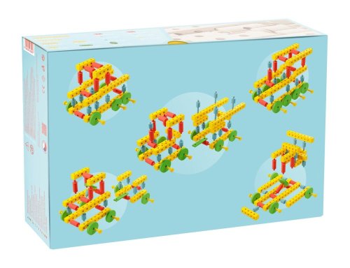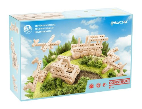 Složte si ze 67 dílků auta nebo zvířátka podle vašich představ. Nebo využijte některý z návodů na krabici a zabavte sebe i své děti na dlouhé hodiny dřevěnou kreativní zábavou. Základní stavebnice CONSTRUCT obsahuje několik druhů dřevěných dílků: bukové válečky průměru 32 mm s kolíky, hranoly 32x32 mm v délkách od 32 do 384 mm s otvory, kolečka o průměru 85 mm a čepy. Tyto dílky umožňují postavit několik různých variant dopravních prostředků, zvířátek a mnoho dalších modelů. Stavebnice je uložena v pevné kartónové krabici, která zajišťuje její dlouholetou životnost a na které najdete inspiraci na složení několika modelů.