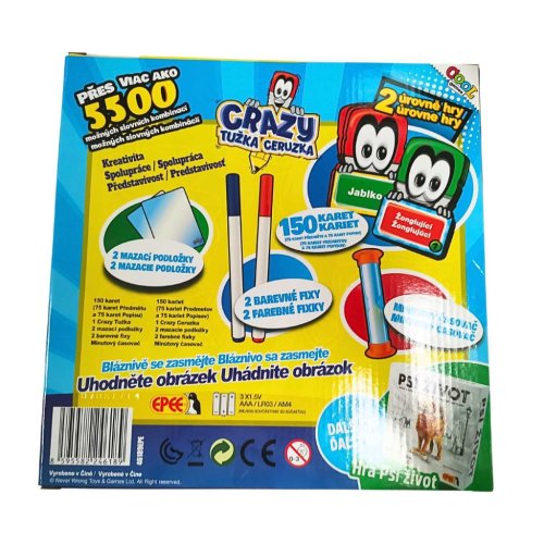 Cool Games Hra Crazy Tužka je zábava pro celou rodinu! Užijte si bláznivé kreslení a hádání s rodinou i příteli. Vylosujte si kartu Předmětu a kartu Popisu, dokážeš je nakreslit třesoucí se Crazy tužkou tak, aby je tvůj tým uhodl? Za uhodnutí získávý tým body a zvítězíte tak nad soupeři. Vhodné pro děti od 6ti let, hra pro 3 a více hráčů. Hra vyžaduje 3 AAA baterie, nejsou součástí.