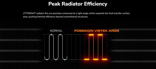 Žebra radiátoru UTTERIGHT jsou přesně tvarována v pravém úhlu, což zvětšuje plochu pro přenos tepla a zvyšuje tepelnou účinnost nad úroveň konvenčních konstrukcí.