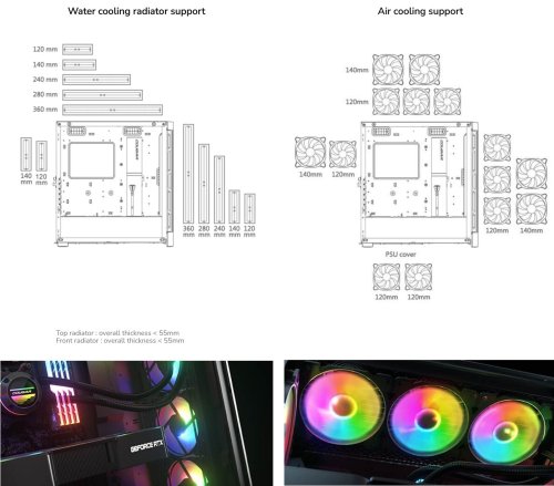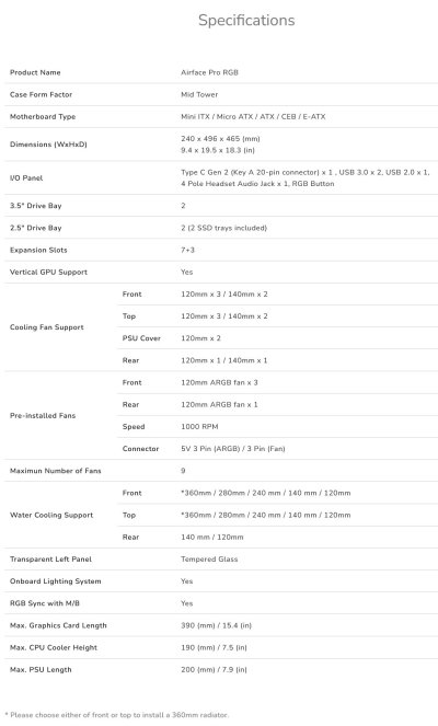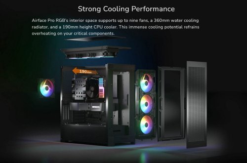 Airface Pro RGB je spojení flexibilního designu, pohodlné montáže a vynikajícího chladicího výkonu. Přední panel přináší vynikající proudění vzduchu a optimalizovaný chladicí výkon. Jedná se o nejnovější model z řady Airface s ještě lepší flexibilitou a důmyslným designem s otevřeným uspořádáním. Airface Pro RGB je šiřoká 240mm a nabízí dostatek prostoru pro nové grafické karty a působivou chladicí kapacitu pro 9 ventilátorů a 190mm chladič procesoru.