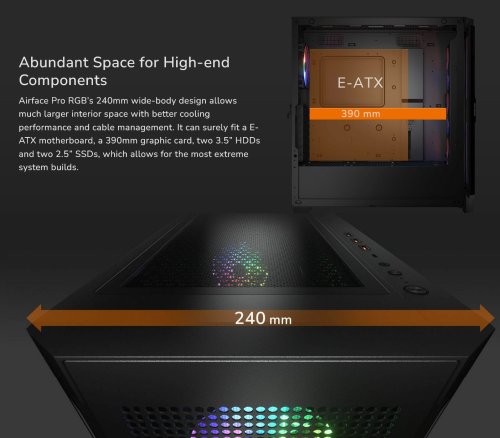 Širokoúhlá konstrukce 240mm skříně Airface Pro RGB umožňuje mnohem větší vnitřní prostor s lepším chladicím výkonem a správou kabelů. S jistotou se do něj vejde základní deska formátu E-ATX, 390mm grafická karta, dva 3,5" pevné disky a dva 2,5" SSD, což umožňuje sestavit i ty nejextrémnější systémy.