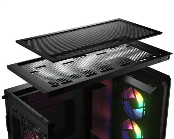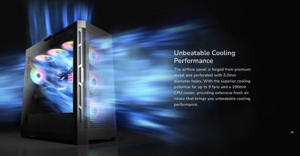 Panel pro proudění vzduchu je vyrobený z prvotřídního kovu a perforovaný otvory o průměru 5,0 mm. Díky vynikajícímu chladicímu potenciálu pro až 9 ventilátorů a 190mm chladič procesoru poskytuje rozsáhlý přívod čerstvého vzduchu, který vám přináší bezkonkurenční chladicí výkon.