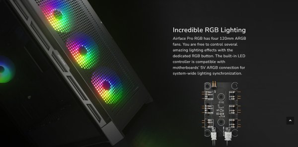 Airface Pro RGB má čtyři 120mm ventilátory ARGB. Pomocí tlačítka RGB můžete ovládat několik úžasných světelných efektů. Vestavěný LED ovladač je kompatibilní s 5V připojením ARGB základních desek pro synchronizaci osvětlení v rámci celého systému.