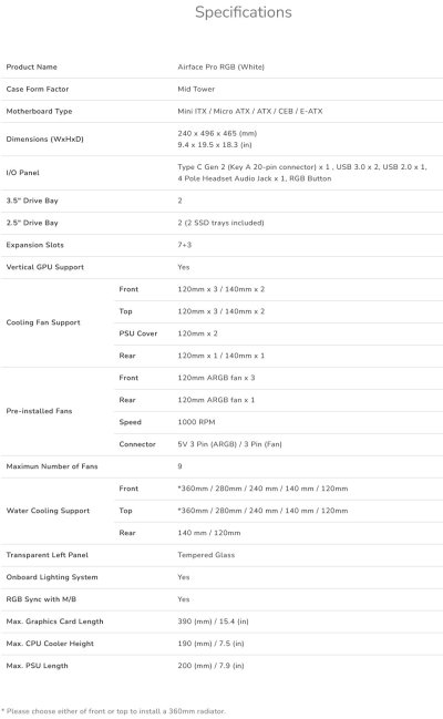 Airface Pro RGB je spojení flexibilního designu, pohodlné montáže a vynikajícího chladicího výkonu. Přední panel přináší vynikající proudění vzduchu a optimalizovaný chladicí výkon. Jedná se o nejnovější model z řady Airface s ještě lepší flexibilitou a důmyslným designem s otevřeným uspořádáním. Airface Pro RGB je šiřoká 240mm a nabízí dostatek prostoru pro nové grafické karty a působivou chladicí kapacitu pro 9 ventilátorů a 190mm chladič procesoru.