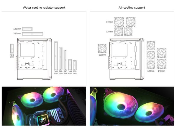Archon 2 RGB’s compact layout allows you to install six fans, a 360mm water cooling radiator, and a 170mm CPU cooler. This immense cooling potential will enable you to choose components freely.