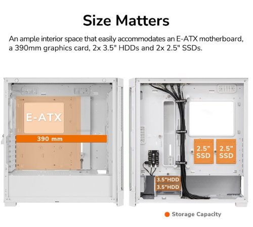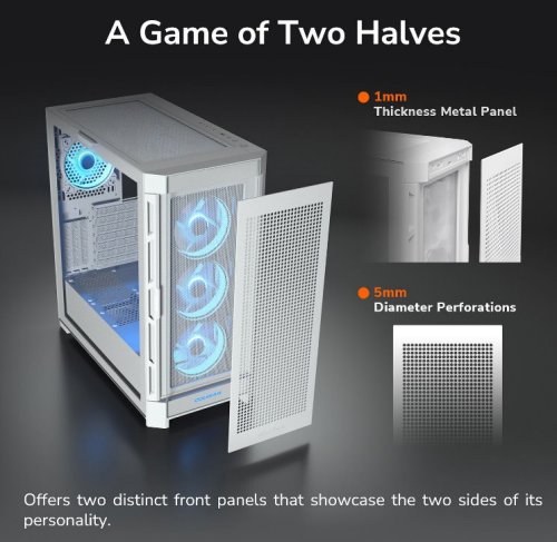 Každý příběh má vždy dvě strany a Duoface Pro RGB není výjimkou. Nabízí dva odlišné přední panely, které ukazují dvě stránky jeho osobnosti: jeden panel vystavuje na odiv oslnivé osvětlení RGB, zatímco druhý je optimalizován pro vynikající proudění vzduchu. Tento nejnovější přírůstek do řady Duoface je skutečným ztělesněním flexibility a inovativního designu s otevřeným uspořádáním.