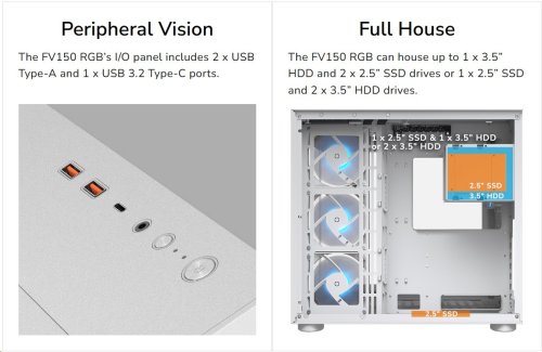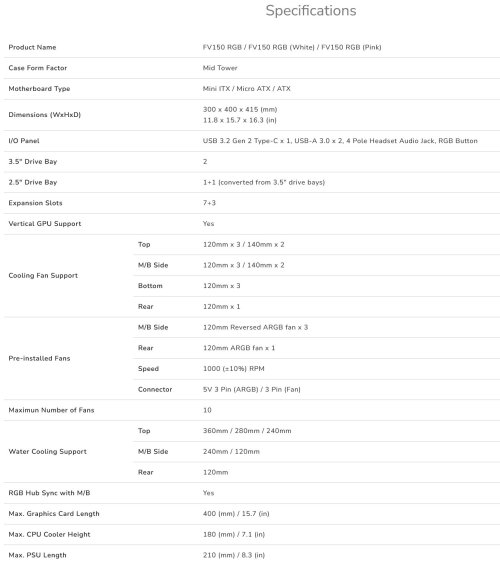 FV150 RGB má kapacitu 3 x 120 mm nebo 2 x 140 mm na horní a spodní straně, 3 x 120 mm ventilátorů na boční straně a 1 x 120 mm na zadní straně. (Boční a zadní ventilátory ARGB jsou, kromě rozbočovače ventilátorů, předinstalovány.) Podpora vodního chlazení dosahuje maximálně 360 mm na horní straně a 240 mm na boční straně.