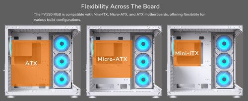 Skříň FV150 RGB je kompatibilní se základními deskami Mini-ITX, Micro-ATX a ATX a nabízí tak flexibilitu pro různé konfigurace sestav.