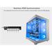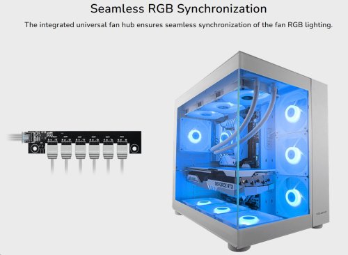 Integrovaný univerzální rozbočovač ventilátorů zajišťuje bezproblémovou synchronizaci osvětlení RGB ventilátorů.