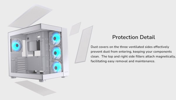 Prachové kryty na třech větraných stranách účinně zabraňují vnikání prachu a udržují vaše komponenty čisté. Horní a pravý boční filtr se připevňují magneticky, což usnadňuje jejich vyjmutí a údržbu.