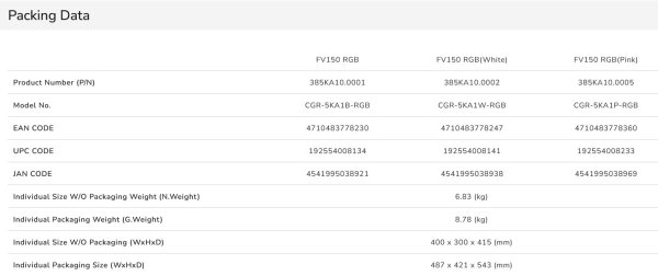 FV150 RGB má kapacitu 3 x 120 mm nebo 2 x 140 mm na horní a spodní straně, 3 x 120 mm ventilátorů na boční straně a 1 x 120 mm na zadní straně. (Boční a zadní ventilátory ARGB jsou, kromě rozbočovače ventilátorů, předinstalovány.) Podpora vodního chlazení dosahuje maximálně 360 mm na horní straně a 240 mm na boční straně.