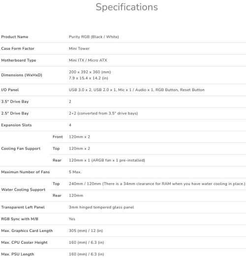 The Purity RGB is a mini tower case designed with clean lines and equipped with a hinged tempered glass panel. The ARGB LED strip and the ARGB fan give it an amazing and modern look. The Purity RGB is a great PC case that supports for a 240mm radiator, a 305mm graphic card, and a 160mm CPU cooler. It delivers both elegant outlook and excellent value for you.