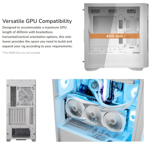 Tento mid-tower je navržen tak, aby pojal GPU o maximální délce 400 mm s možností horizontální/vertikální orientace bez držáků, a poskytuje tak prostor, který potřebujete k sestavení a rozšíření své sestavy podle svých požadavků.