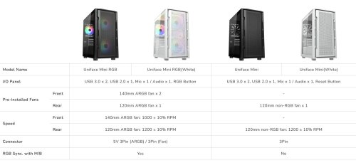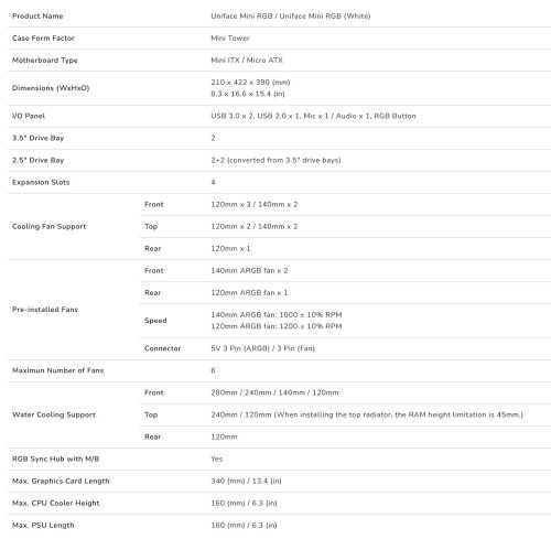 Díky klamavě kompaktnímu uspořádání, které umožňuje instalaci až 6 ventilátorů, podpoře GPU o velikosti až 340 mm a možnosti volby mezi 280mm (maximálně) radiátorem vodního chlazení nebo 160mm (maximálně) vzduchovým chladičem, je Uniface Mini RGB důkazem, že velké věci přicházejí v malých baleních.