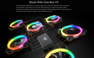 With COUGAR CORE BOX V3 controller (optional), COUGAR VORTEX VK120 cooling fan can maximize its performance. It not only allows players to create the exclusive high-performance cooling system but also having perfect ARGB lighting effect. So, this combo set must be the best choice for setting unique ARGB gaming PC.