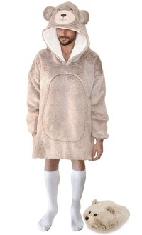 Velká mikina s kapucí s motivem zvířátka, která plní funkci teploučké, měkoučké a nadýchané deky, jež zahřeje při každé příležitosti. Vnitřek mikiny byl vyroben z hřejivého nadýchaného sherpa fleecu a lícová strana ze super měkkého hebkého materiálu, používaného na výrobu těch nejměkčích dek. Všechny mikiny z této řady mají i velikou přední kapsu, ve které se dají krásně ohřát studené ruce. Každý se v ní bude jistě cítit pohodlně, ať už doma na gauči při sledování televize, čtení knížky, nebo jiném druhu odpočinku, kdy ho nijak nebude omezovat v pohybu. Dobré využití se najde třeba i při práci na PC, kdy se člověk opravdu moc nezahřeje. Velmi praktická je ale i při stanování či jiných outdoorových aktivitách nebo jen tak při venkovním posezení na zahradě v chladnějším počasí. Tato mikina a deka v jednom od značky Cozy Noxxiez je krásným a praktickým dárkem pro ženy i muže, díky vtipným potiskům, nebo variantě bez nich. V nabídce Cozy Noxxiez najdete v některých motivech i ucelené kolekce, které obsahují: hřejivý plyšový polštář 3 v 1, obří hřejivý pantofel, nebo hřejivou deku s kapucí se zvířátkem a tlapkovými kapsami a můžete mít tak celou zahřívací sadu perfektně sladěnou.