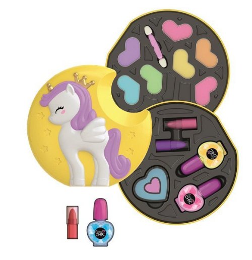 Kosmetická sada pro dívky, které milují módní jednorožce. 2 palety plné stínů, mini rtěnek, lesků na rty a laků, také s náhradními náplněmi, abyste je měli vždy po ruce!